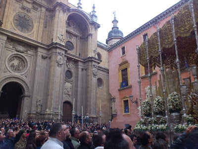 La procesión magna acabó en torno a las dos de la madrugada con las entradas de la Virgen de la Esperanza y la del Rosario Coronada, nosotros optamos por ver la entrada de esta ultima, ya que vimos en la misma plaza de Santo Domingo, la entrada de la Virgen del Rosario( Hdad de las Tres Caídas), la Virgen de la Victória (Hdad de la Sagrada Cena) y la Vírgen del Rosario Coronada (co-patrona de Granada).